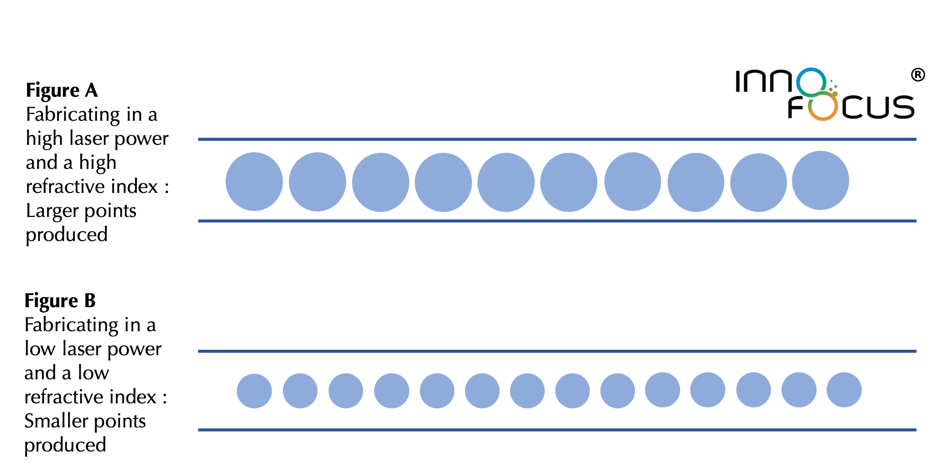Our intelligent femtosecond laser power control technology can also meet the needs of introducing different refractive index distributions. As shown in Figure 2, the points in an FBG manufactured by a high laser power are larger in size with a higher refractive index change (Figure A), whereas points manufactured at a low power are smaller in size (Figure B). By changing the system’s parameters, various flexible needs can be met. The fully automated power system effectively avoids the variation in quality caused by laser power fluctuation. It allows for long-time, large-scale, repeated FBG manufacturing, resulting in high-quality mass production of FBG.