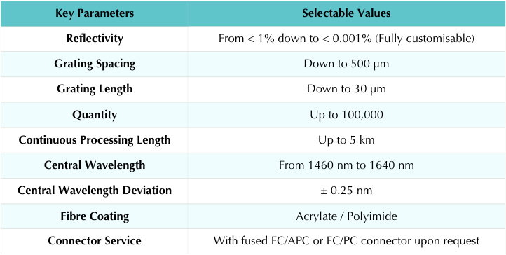 UFBG_S are femtosecond laser fabricated single Fibre Bragg Gratings with standard reflectivity.